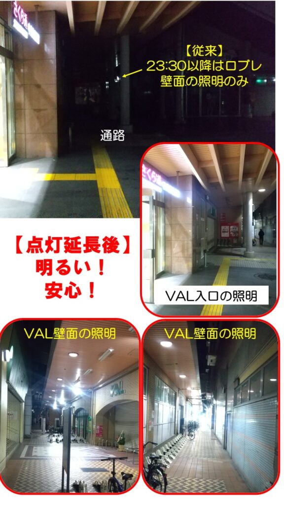 従来は23:30でVALの照明が消えてロブレ壁面の照明のみとなりかなり暗い状態だったため、関係箇所にお願いし点灯時間を延長していただきました。