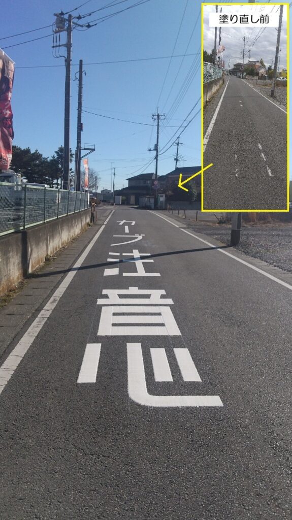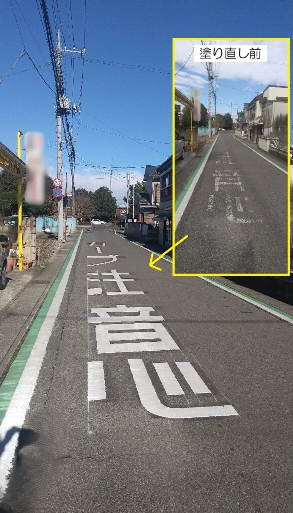 さらに<<<<の道路標示も入れてくださり、車の通行すべき方向や位置が明確になって接触・衝突リスクも低減されました。