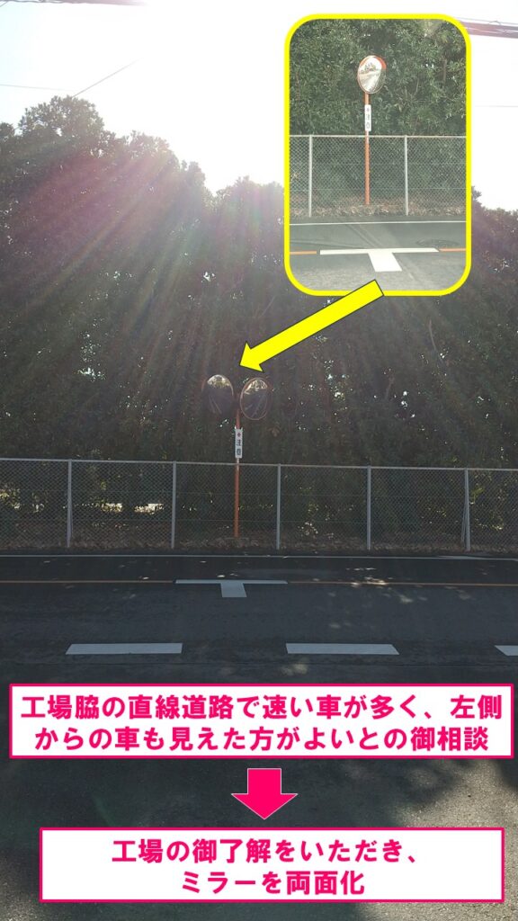 ミラーは工場の敷地内に立っているため工場の責任者の方に相談したところ快く両面化を御承諾くださったので、市の担当課に両面化を依頼。無事に左側にもミラーがつきました。