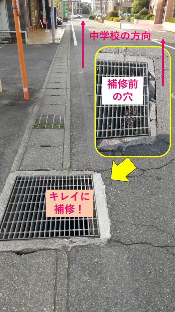 もし自転車がこの穴に気付かずスッポリはまったら転倒するし、そこに車が来たら…と思いすぐに担当課に連絡すると、応急処置としてカラーコーンを置いてくださり、その後きれいに補修してくださいました。