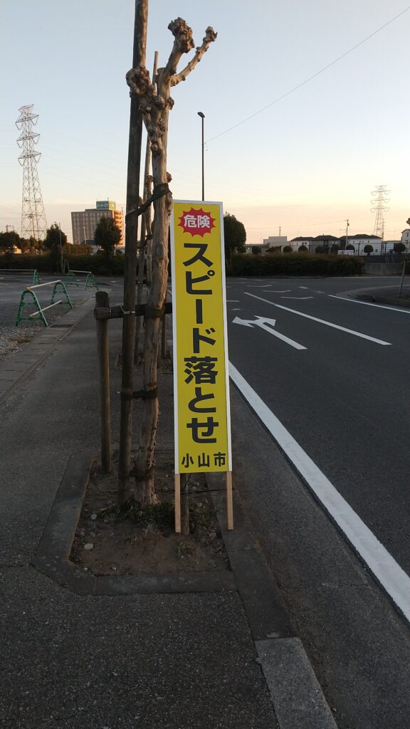 「スピード落とせ」看板取り付け